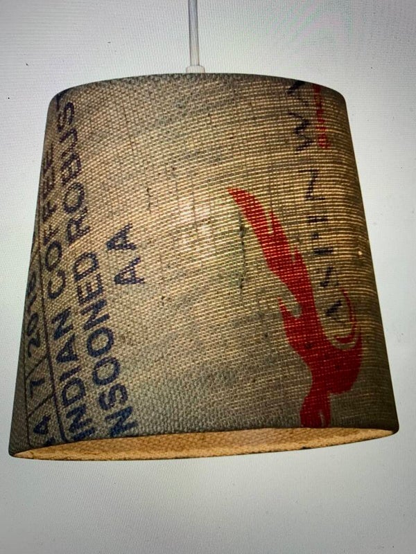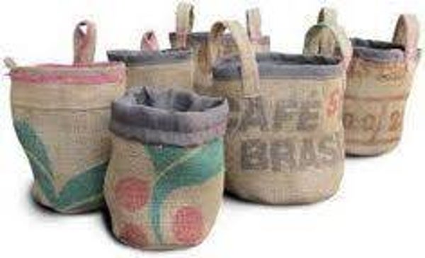 (E) Burlap coffee bags that we get in with our unroasted coffee beans in them. So they are original bags that have been used once.