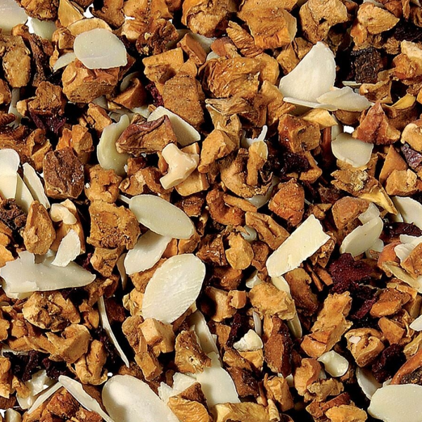(E) The high portion of sweet apple pieces provides a low acid base, and the red hue comes from the added beet. The flavor note is defined by enticing, sweet, toasted, caramelized almonds. It is a taste experience that your nose and palate know and appreciate Our tip: just try it and ... enjoy! For perfect flavor impact, steep about 5 grams of tea in boiling water for 10 minutes. Packed in resealable bag of 100 grams. Ingredients: apple pieces , chopped almonds, almond flakes, cinnamon pieces, beet, aroma.