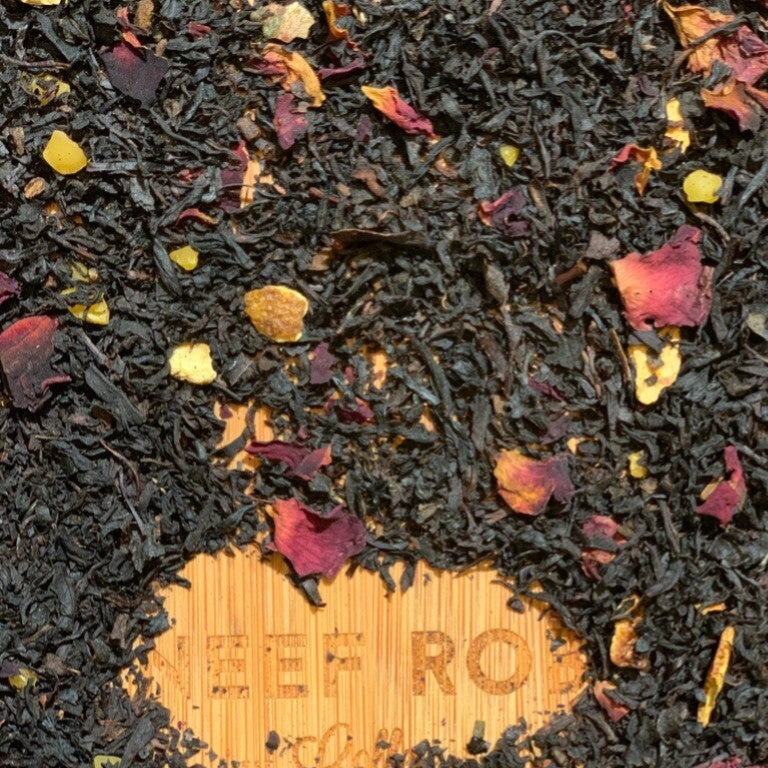 zwarte thee met rozenblaadjes, amandelen, kruitnagel, vanille en kardemom